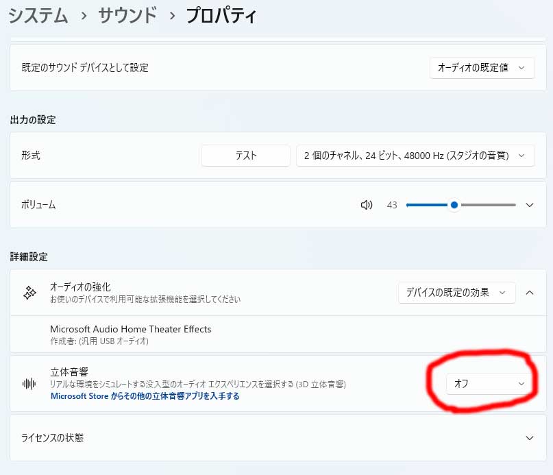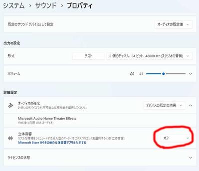 とりあえず、デフォで立体音響がONになっていたのでoffにしてみる